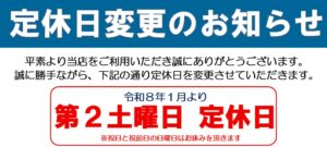 誠に勝手ながら令和8年1月より毎月第2土曜日を定休日と